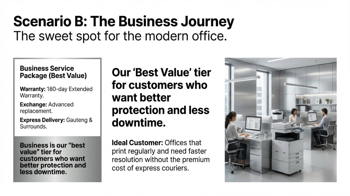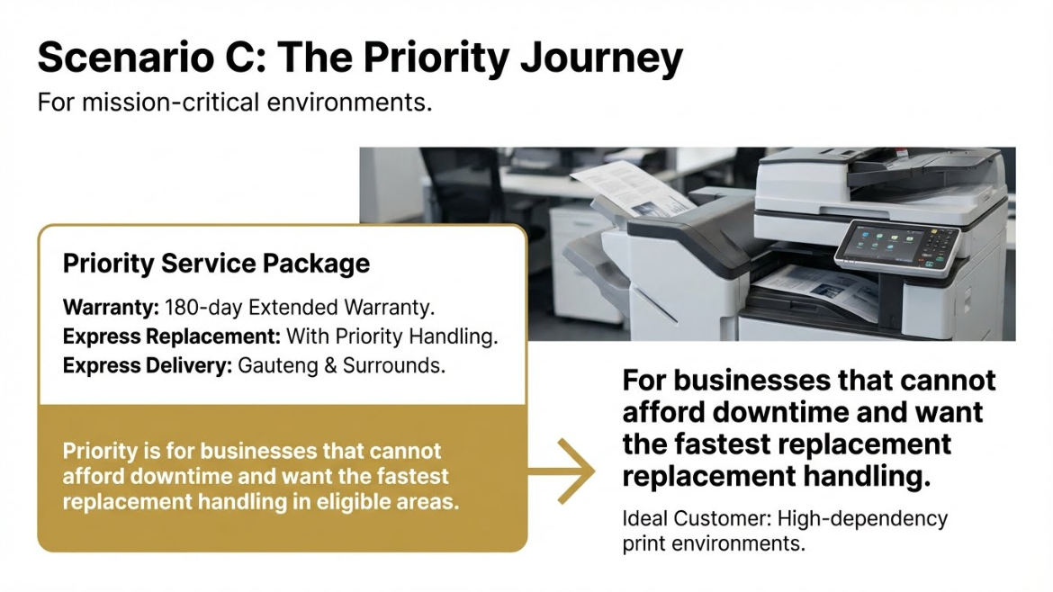 The Priority package is built for businesses that simply can’t afford delays. It includes a 180-day extended warranty, express replacement with priority handling, and express delivery in eligible Gauteng areas.