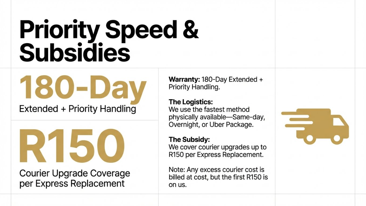 Replacements are fast-tracked and shipped using the quickest available method (same-day, overnight, driver, or Uber where available). We also subsidise courier upgrades up to R150 per claim, with usage managed through a token system based on your Priority purchases.