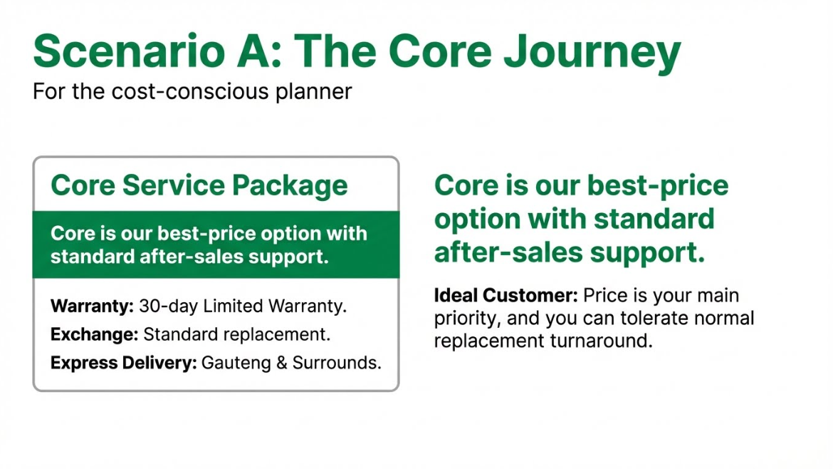The Core package is designed for customers who want the lowest possible price and are comfortable with standard replacement turnaround times.