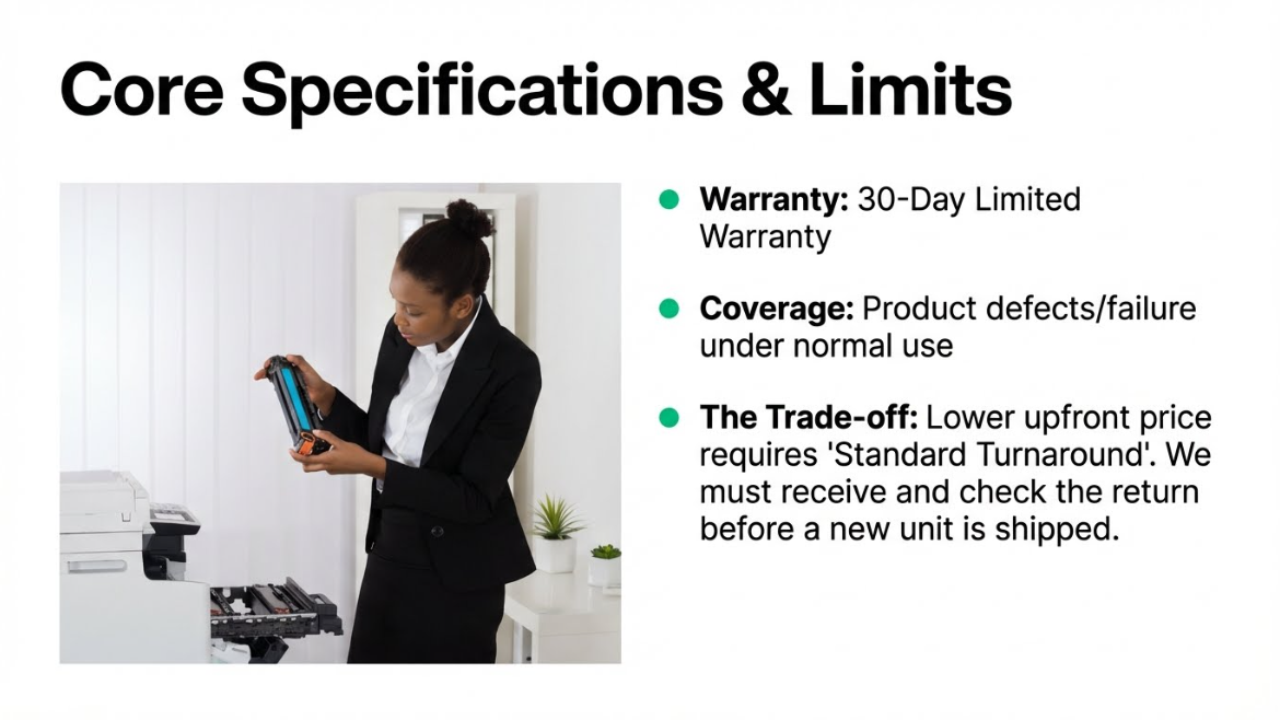 It includes a 30-day limited warranty, standard exchange after assessment, and standard delivery (with faster options available at checkout in eligible areas). If an issue arises, basic troubleshooting is required and the cartridge must be returned for inspection before a replacement is issued.